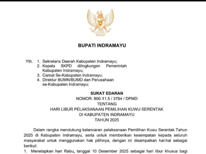 Suaradermayu.com – Pemerintah Kabupaten Indramayu resmi menetapkan Rabu, 10 Desember 2025, sebagai hari libur khusus bagi desa-desa yang melaksanakan Pemilihan Kuwu (Pilwu) Serentak. Kebijakan tersebut tertuang dalam Surat Edaran Nomor 800.11.5/3784/DPMD, yang ditandatangani Bupati Indramayu Lucky Hakim pada 2 Desember 2025.
