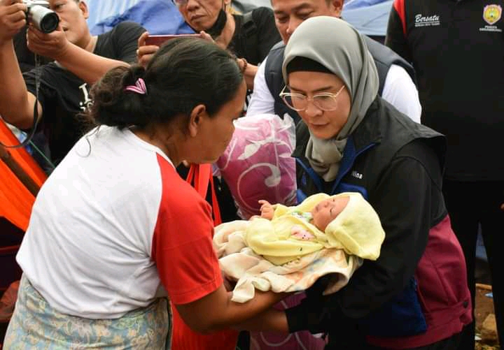 Kehadiran Bupati Nina bersama rombongan disambut haru warga yang terdampak gempa. Bupati Nina memberikan dorongan motivasi kepada para korban gempa bumi, bahkan Bupati Nina sempat menggendong seorang bayi dan melihat kondisi korban yang mengalami luka.